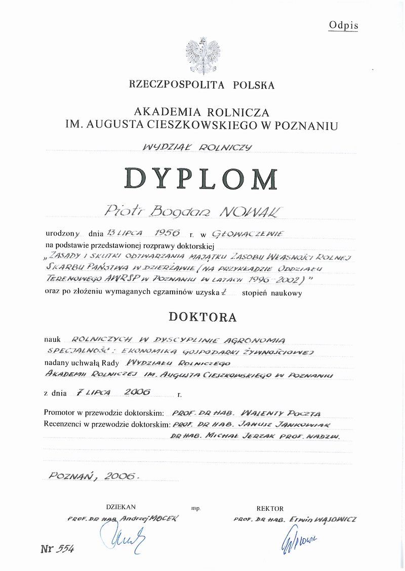 - Zasady i skutki odtwarzania majątku Zasobu Własności Rolnej Skarbu Państwa w dzierżawie - Praca doktorska opublikowana przez Wydawnictwo AR w Poznaniu (2007).